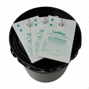 For easy collection of soil gases, low-pressure samples or where cylinders would be difficult to use, we can provide these evacuated gas bags. Sets of three 0.3 liter bags packed in five-gallon shipping containers (paint cans) are available for shipping flammable gas samples.